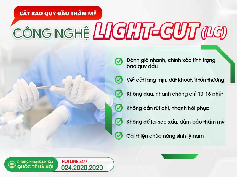 Light – Cut là công nghệ cắt bao quy đầu thế hệ mới, sử dụng hệ thống vi phẫu thuật cùng dao cầm máu của Mỹ, chỉ nano tự tiêu, giúp xâm lấn tối thiểu vết cắt láng mịn, dứt khoát, ít chảy máu, không cần rút chỉ. Thẩm mỹ cao – hồi phục nhanh. Thời gian thực hiện chỉ 10 – 15 phút.